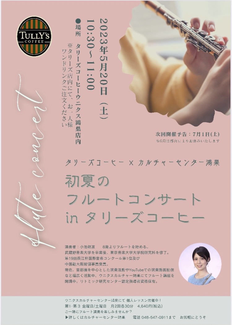 「初夏のフルートコンサート in タリーズコーヒー」に出演致します。