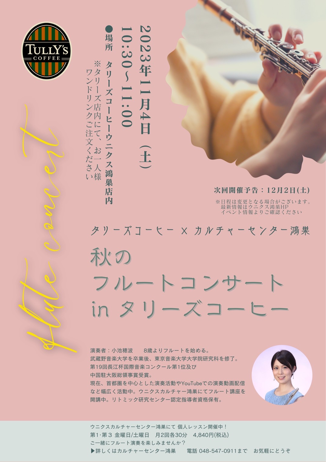 「秋のフルートコンサート in タリーズコーヒー」に出演致します。